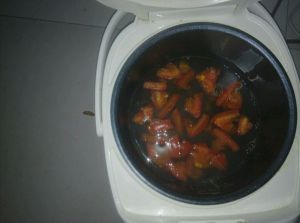 待西红柿翻炒至变软出沙,加入2~3碗水