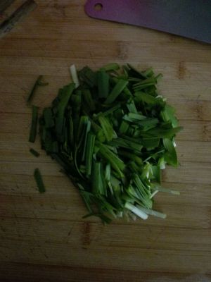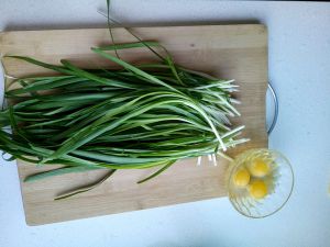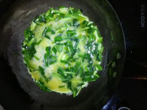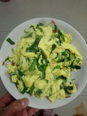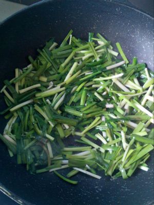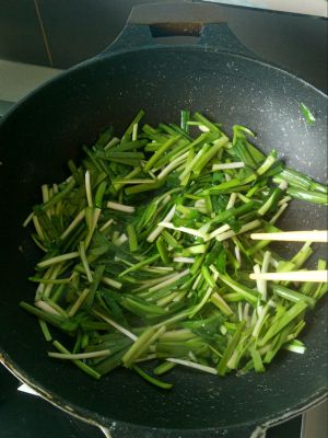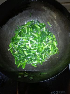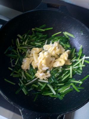 锅烧干加入油烧热,加入葱姜爆香,加入韭菜,翻炒两遍后加入备好的鸡蛋,翻炒至韭菜变色后加入盐、鸡精翻炒均匀出锅装盘