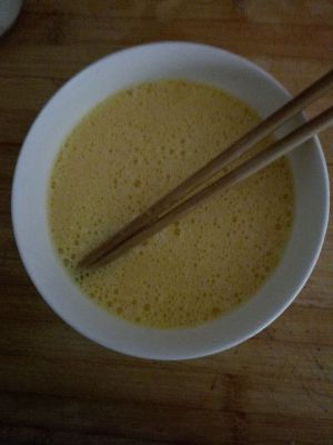 韭菜洗净控下水,切小小段,放入大碗中,加入鸡蛋,用筷子打散打匀,加盐,再打匀。