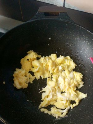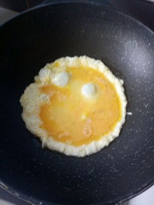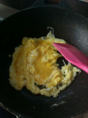锅烧干后加入油烧热,加入鸡蛋烧煎成蛋饼,切成合适小块后备用