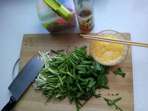 韭菜切成段,鸡蛋加盐+一点点料酒打散