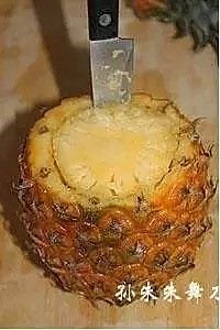 4将菠萝肉用刀剜出来,再用勺子将里面剩余的菠萝肉挖出来,将菠萝修整成一个空心碗状,很好弄的,亲手试试就知道了( 挖出来的菠萝切小丁 一定要用淡盐水泡一下哦,不然会感觉有点辣不好吃