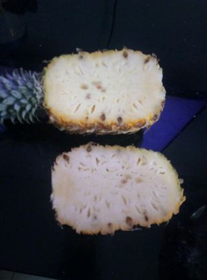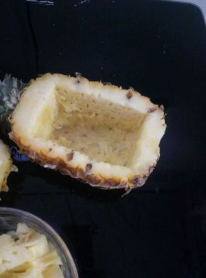 1,把菠萝从上五分之一处切下,留下做盖!果肉用水果刀和勺子挖出。