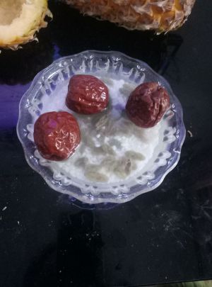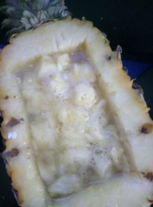 把枣撕碎放入菠萝内,用勺子把菠萝内的东西搅匀