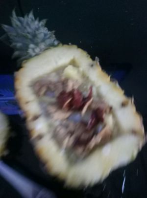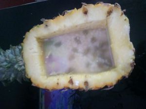 4,把拌好的装进菠萝里,盖上盖上锅蒸半小时。