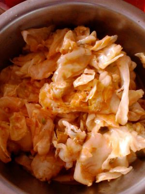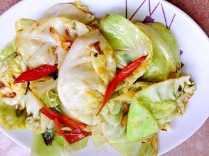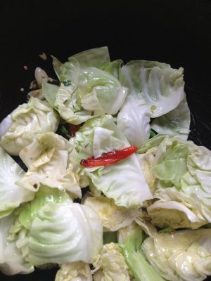 炒出香味后,放入卷心菜,炒至稍稍变色,放入陈醋、老抽翻炒均匀。
