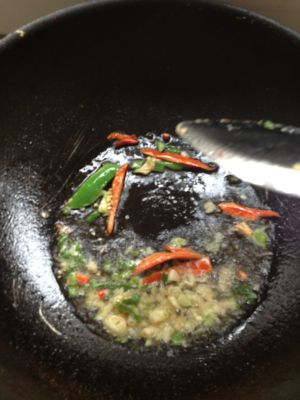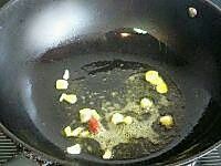 锅中油热后,关小火,放入蒜片爆香,再放入花椒、红椒段。(有干红椒放干红椒更好)