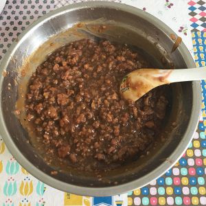 准备一个不粘锅,把肉馅倒入不粘锅中加热,倒入淀粉,搅拌均匀,煮到浓稠状就可以了。