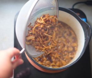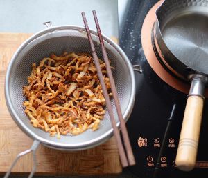 连油一起倒在筛网中,滤油,冷却。红葱酥完成。
