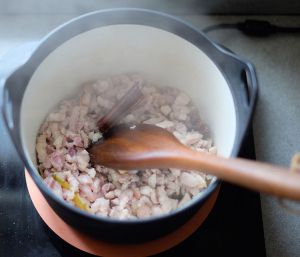 热锅冷油,先洋葱煸炒出味,下葱姜,再下五花肉翻炒出油,最后放香菇丁,一起炒。加两勺黄酒,热水没过所有食材。