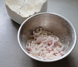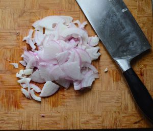 没有买到红葱头,所以用了红洋葱。去皮,切成薄片。