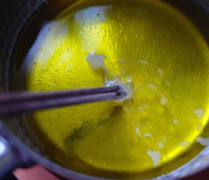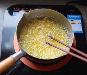 锅中倒入山茶油,用电磁炉“煎烙”模式800瓦,加热至筷子放进油锅中会产生小气泡。