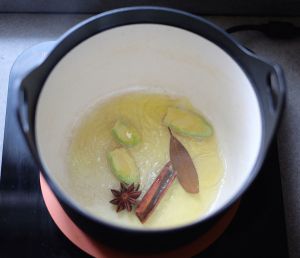 选用电磁炉的“烧菜”模式1400瓦,锅热了后放入适量山茶油,再放入生姜、八角、月桂叶和肉桂,炒香。