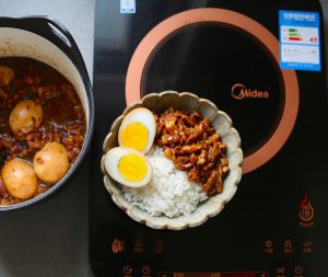 舀入一勺煮好的卤肉,卤蛋切半,鲜香入味。光洁晶莹的米饭,配上鲜美的食材和浓郁的汤汁,每一口都有滋有味![3]