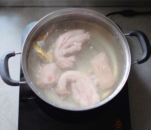 锅中放入适量料酒和几片生姜,用电磁炉的“烧水”模式烧开一锅水,放入五花肉,烫入血沫后捞出。
