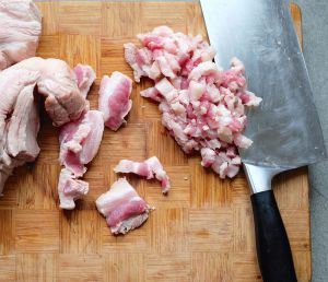 肥瘦相间的五花肉,洗净切成小块肉丁。