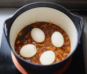 煮开后转成“炖熬”模式120瓦,盖上盖子,炖20分钟后放入鸡蛋,再加入生抽2大匙,翻拌均匀,盖好盖子再煮20分钟左右至汤汁黏稠浓郁,熄火。