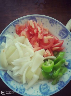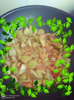 热油锅~放入葱姜蒜爆香,先放去洋葱,然后依次放入茄子西红柿青椒,调味汁,大火烹炒5min