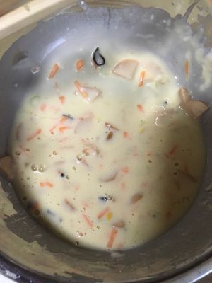 将面粉,鸡蛋加水调成稀糊状,加入火腿丁、胡萝卜丁、木耳丁、所以调料拌匀。