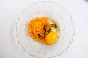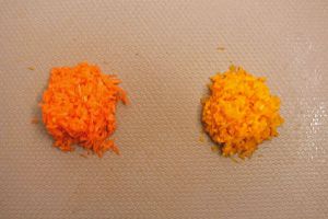 胡萝卜和南瓜分别刨成细丝,剁成末备用。