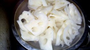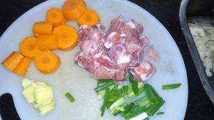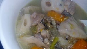 乘足量冷水,将排骨,胡萝卜,莲藕,眉豆,葱,姜置入,留小部分葱备用。 武火至沸10分钟,改文火45分钟
