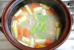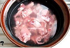 大火煮开转小火焖煮大致35分钟,然后倒入处理好的淮山一起焖炖。淮山具有一定的黏液并且很敏感,为此在刮皮时一定要戴上手套避免过敏发痒。