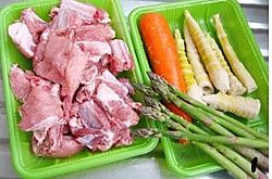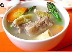 材料:排骨500克、芦笋50克、胡萝卜1根、春笋100克、姜片10克、盐5克、醋半勺、白胡椒2克,清水适量;