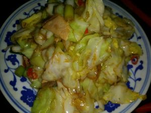 油锅加水加盐加酱油,烧开后倒入包菜棹水一分钟出锅。浇上爆好的辣椒油,淋上蚝油,哇…