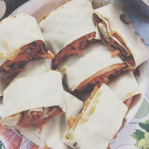 铺千张的步骤又忘记拍了 只有成果(˘̩̩̩ε˘̩ƪ) 过程就是铺好千张 抹一层豆瓣酱 接着铺满胡萝卜炒肉 (再放入其他东西都行噢!) 然后从左折到右 用刀分成几块 就完成啦!!⁽⁽ૢ(⁎❝ົཽω❝ົཽ⁎)✧