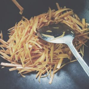 胡萝卜倒入油锅炒一会,加青椒翻炒。然后加盐,鸡精调料。