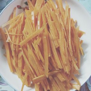 蒜苔切段,胡萝卜里脊肉切条(不要太细)青椒切细条,姜切细丝