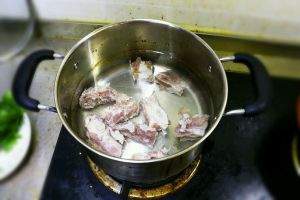冷水下锅煮开,焯水,煮十几分钟,然后倒出洗净,洗掉排骨上的血沫。