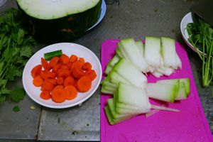 胡萝卜切厚约5mm的均等块儿,冬瓜去皮切约6―7mm的厚片,放一旁备用~