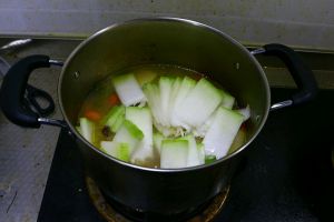 下入胡萝卜块熬制10分钟后再下入冬瓜片,盖盖儿继续熬煮~