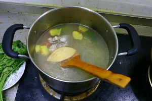 五六分钟左右 水面冒气泡 水开后 用筷子把排骨夹入水中 此时改成小火