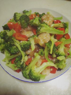 先抄虾仁,后放入西蓝花,甜椒,起锅即可。