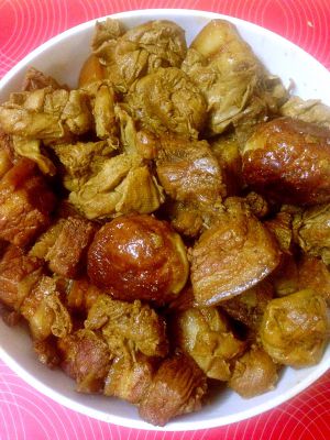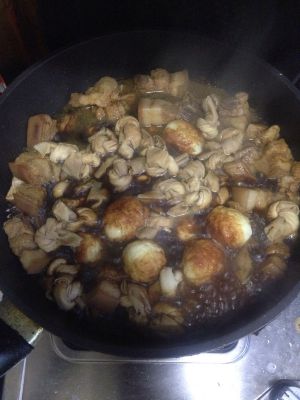 切生姜抓点八角和肉一起下锅炒炒,其实可以先用白糖炒糖色出来,再下肉 ,可我懒啊,省了这步,炒到肉出油后加老抽 ,酱油,和上面说的调料,不要放盐,等肉上色,加入鹌鹑蛋,炒炒,倒入水盖上锅盖焖到水烧干。