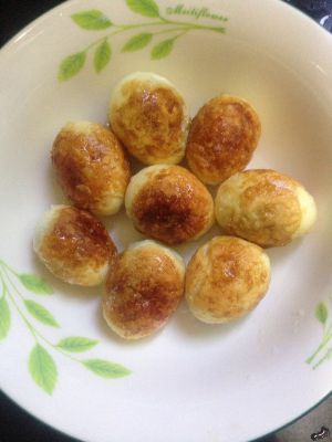 3、起油锅将熟鸡蛋入内均匀上油煎透,表皮变金黄色即可,这就是虎皮蛋