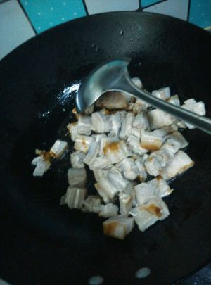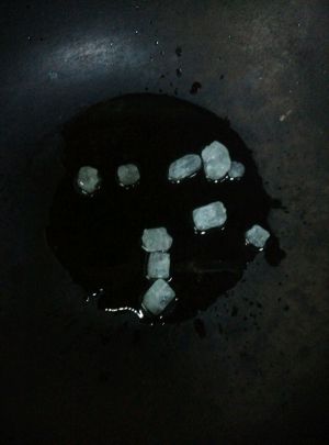 炒锅倒油,放冰糖,小火翻炒,炒出糖色。