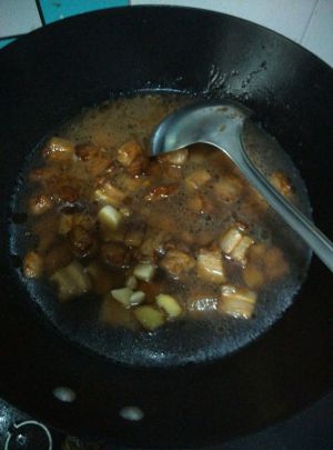 水的量要没过猪肉,放入姜蒜料酒,大火烧开转小火炖40分钟-1小时,如果是带皮五花就要1个半小时以上,收汁即可。