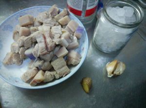 猪五花肉整块与两片生姜,少量料酒一起凉水下锅烧开后捞出洗净,切成小块,备齐料