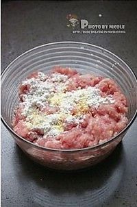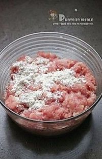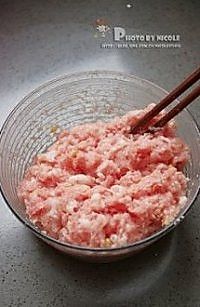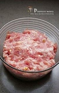 肉馅加剁碎的笋干,加盐、料酒、酱油、淀粉,打一颗蛋进肉馅里,朝一个方向打匀