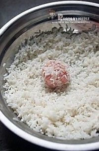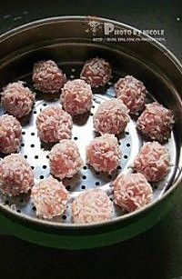将肉馅搓成团,裹上一层糯米。糯米事先浸泡3个小时。上锅蒸熟即可~
