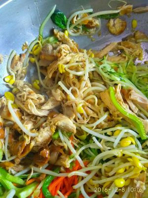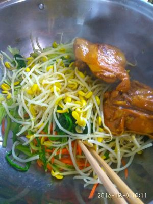 黄豆芽,菠菜焯水,黄瓜,胡萝卜,青椒切丝待用