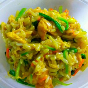 淀粉加少许水,勾芡,汁要浓稠,根据自己口味调咸淡,做成拌饭汁