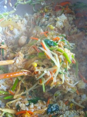 开始拌饭,,,一勺卤鸡腿汤,,一勺拌饭汁,一碗米饭,所有蔬菜