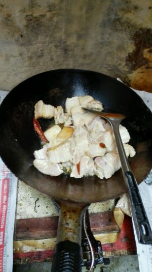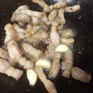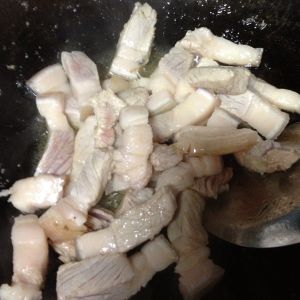 把少量的油到锅里待油热后把五花肉放进去翻炒