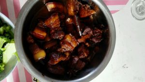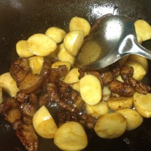 开盖,转大火,这时要不停地翻炒,使渐渐变得浓稠的汁水均匀地裹住每一块五花肉。