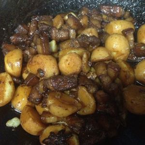 另起锅,锅里放少量油,入五花肉煸炒半分钟,倒入老抽、生抽、料酒、八角、盐、糖,倒入刚才煮五花肉的热水,水开后,盖盖,转中小火焖40分钟。
