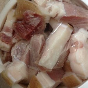 五花肉取出后,用清水冲洗干净,拔去五花肉上的硬毛,并把五花肉切成小块。